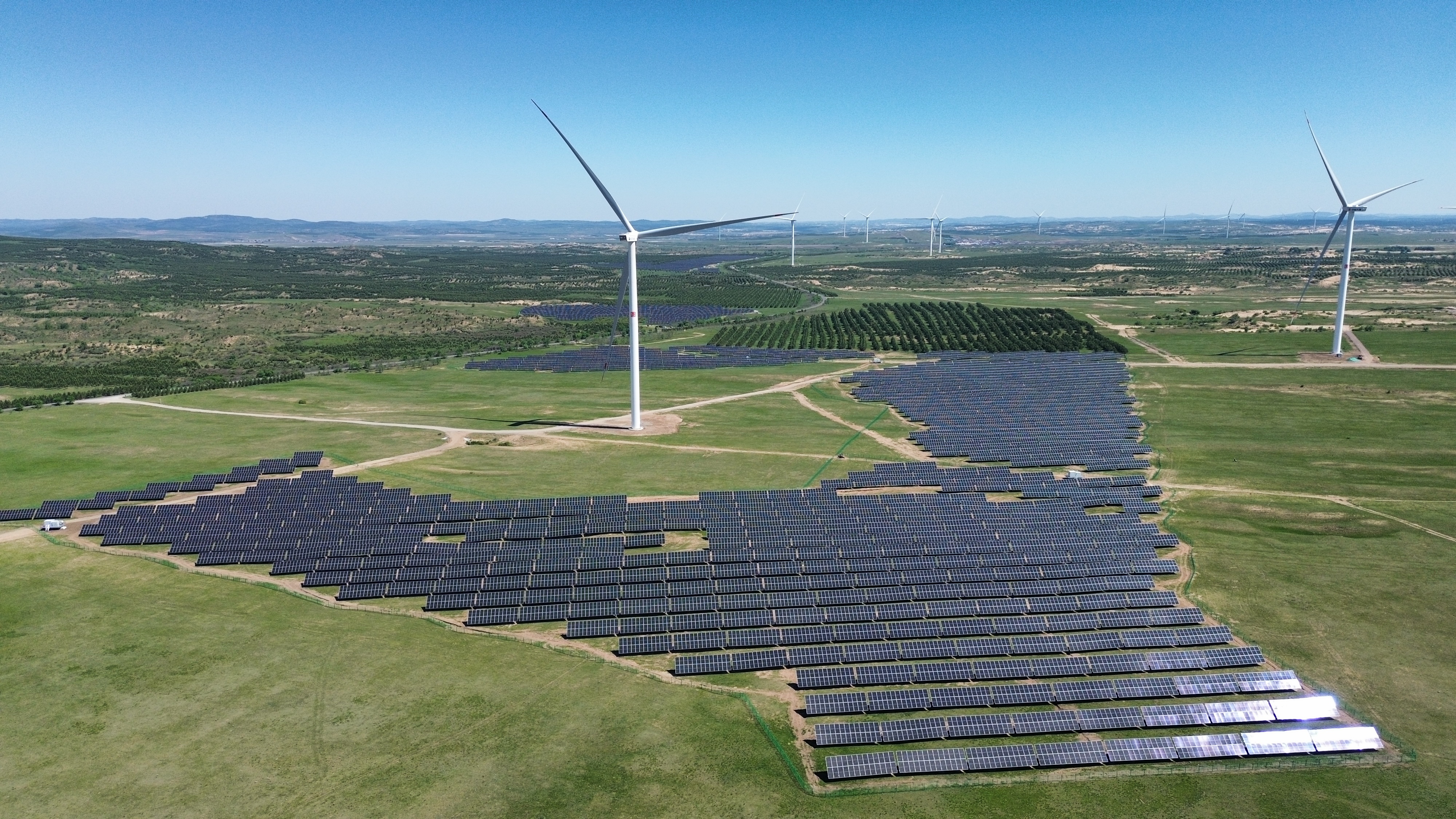新能源分公司先后建成風電及光伏項目224個,總?cè)萘?1948MW,其中建成光伏項目33個,容量1566MW;建成風機機組4152臺。在建新能源項目25個,其中EPC風電項目2個,容量100MW,EPC光伏項目7個,容量457MW。送變電工程公司在建光伏項目4個,容量420MW;在建風電項目2個,容量74.5MW,風機機組22臺。
